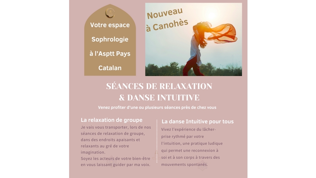 A l'issue d'une formation de 9 mois, la sophrologie est à votre service pour votre bien-être. Je suis sophrologue intuitive. Pourquoi intuitive car je possède diverses outils pour vous accompagner. Ma voix pour vous détendre et vous relaxer, la relaxation pneumo-phonique pour agir directement sur votre corps et les douleurs physique, le magnétisme pour soulager le maux rapidement, l'acupressure pour travailler des zones spécifiques. Une boite à outils complète à votre disposition. Des séances de relaxation de groupe sur Canohès plusieurs fois par semaine mais aussi des séances individuelles en cabinet ou à votre domicile.